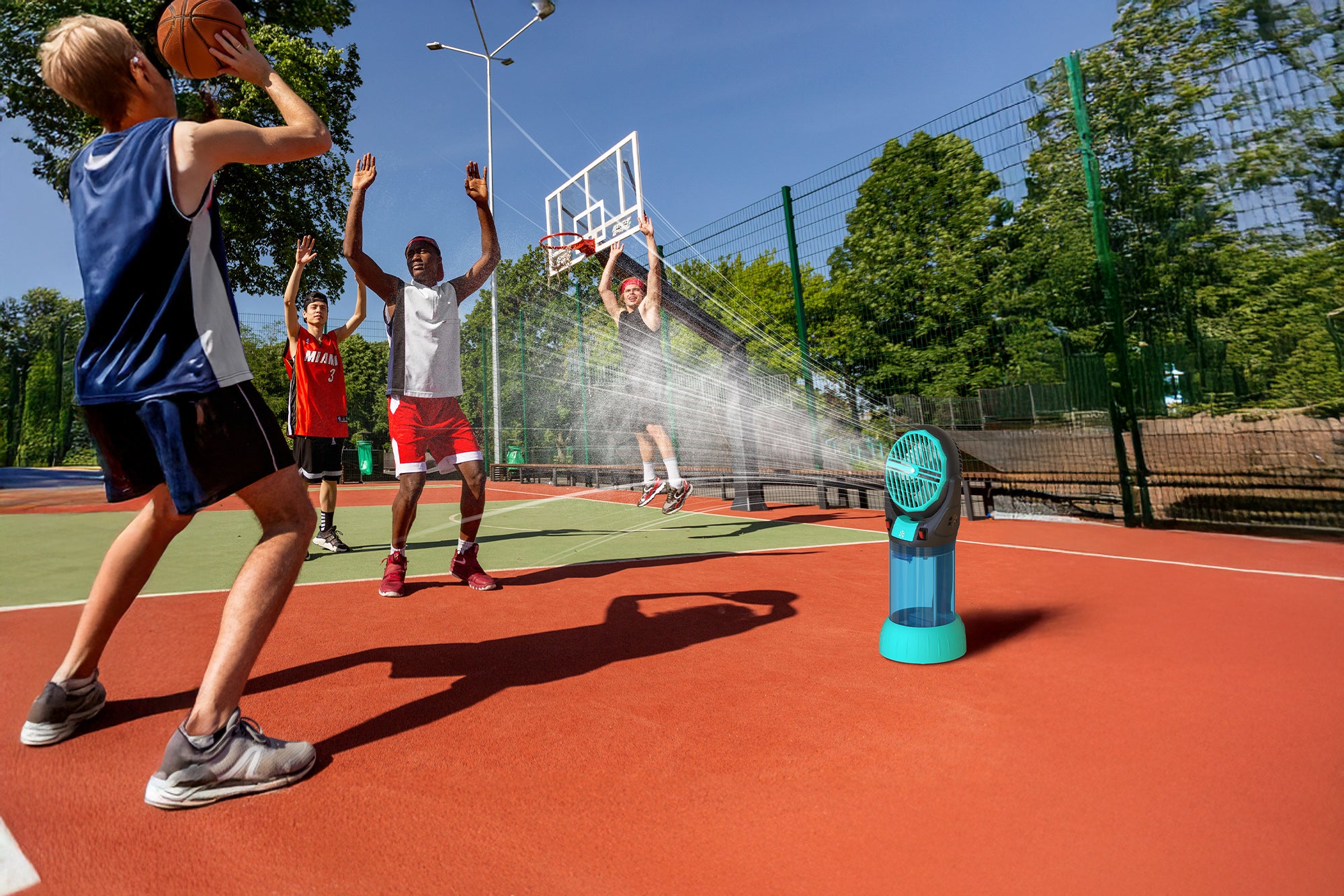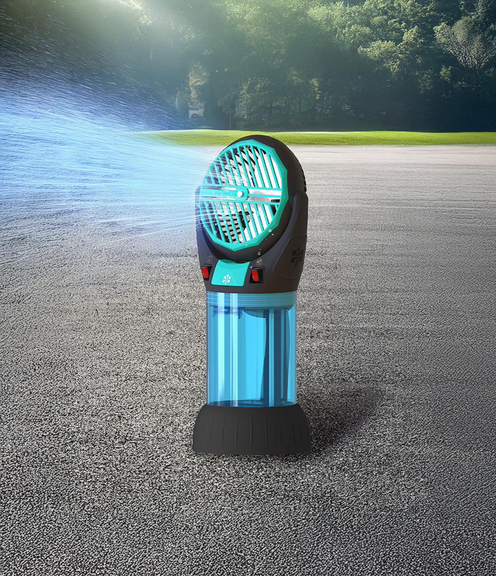 Featuring a 1.5-liter water tank, the AlphaCool High-Velocity Portable Misting Fan provides up to 1 hour of continuous misting, with a battery life of up to 3 hours.